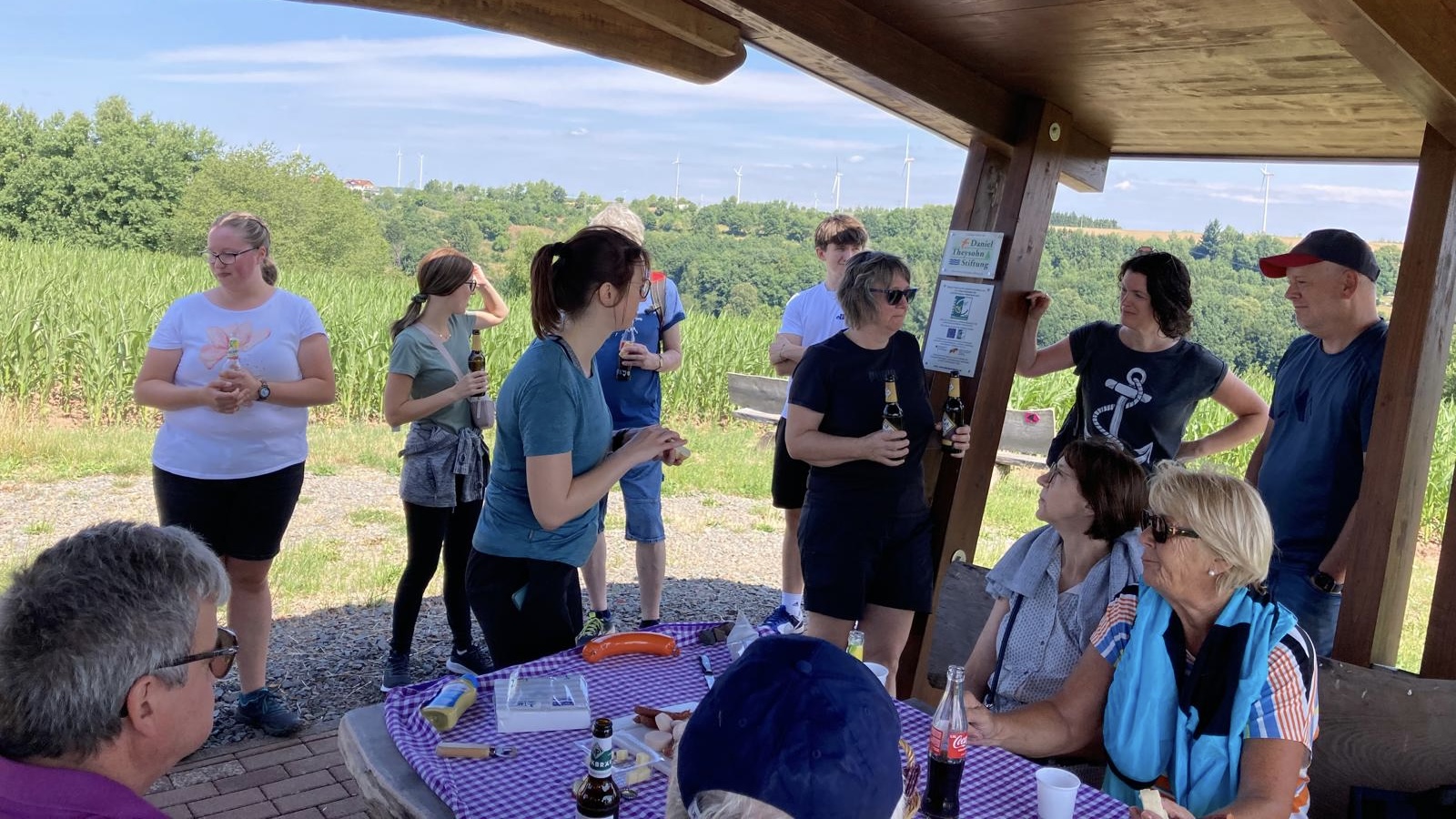 Bei bestem Wanderwetter führt die Route über die Hasenwiese und das alte „Hasenpfädche“ hinauf, vorbei an der Straußenfarm bis zum Aussichtspunkt „Holzlandblick“. Von dort genießen die Teilnehmenden einen beeindruckenden Panoramablick über Horbach, Steinalben, Schopp bis hin nach Geiselberg und Heltersberg. Dort stärken sich alle mit einem kleinen Snack, bevor es gut gelaunt weitergeht.